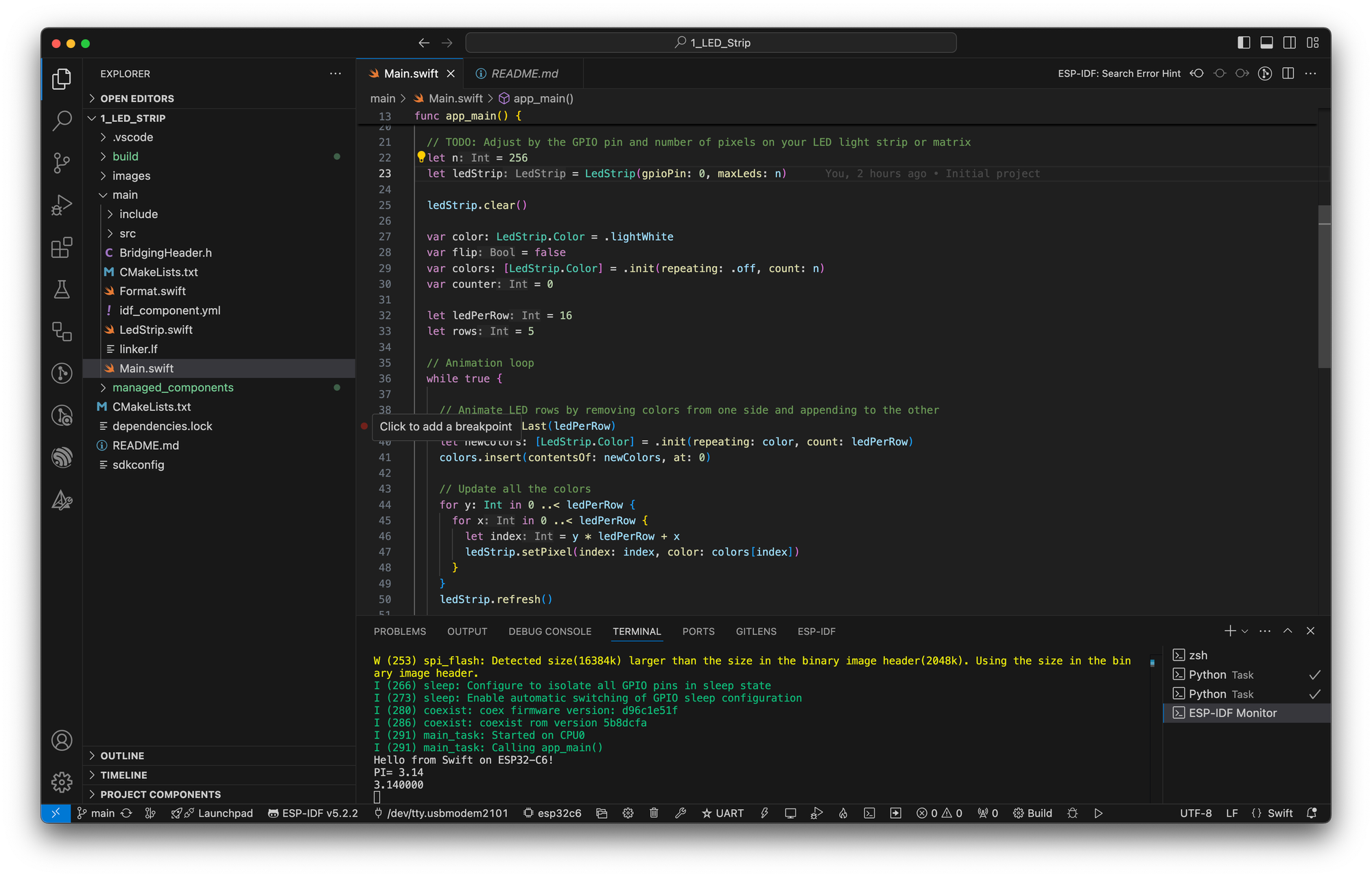 The Embedded Swift Beginners Guide will help you jumpstart your journey with Embedded Swift. You will learn how to get started with Visual Studio Code so that you can enable LSP Code Completion and look up documentation as you write Embedded Swift code. My sample project connects to a LED matrix (LED Strip) and creates a rolling animation.