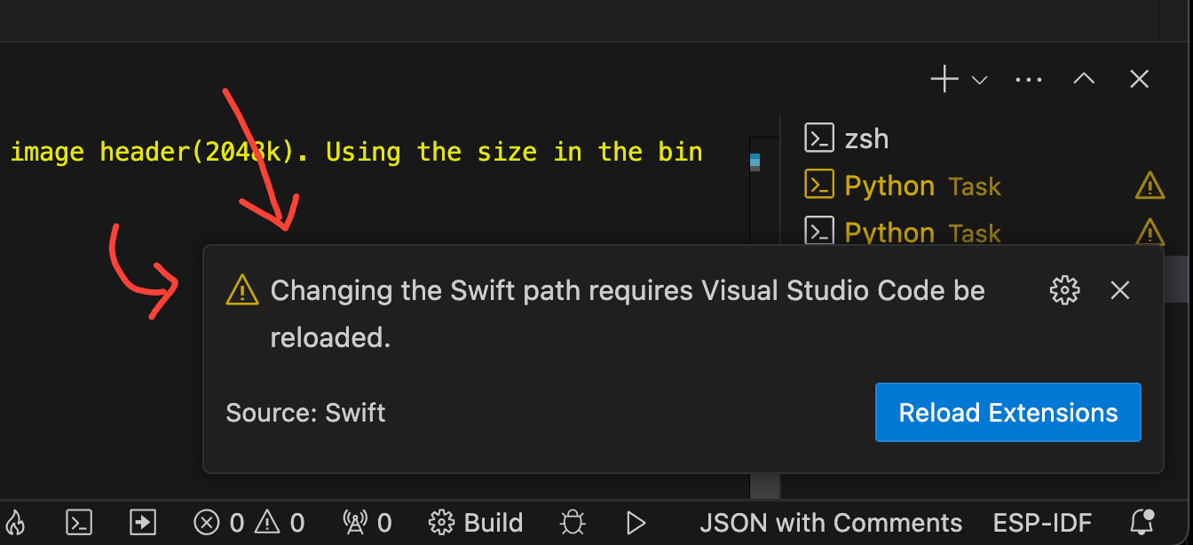 Visual Studio code needs to reload any time you make changes to the Swift path.
