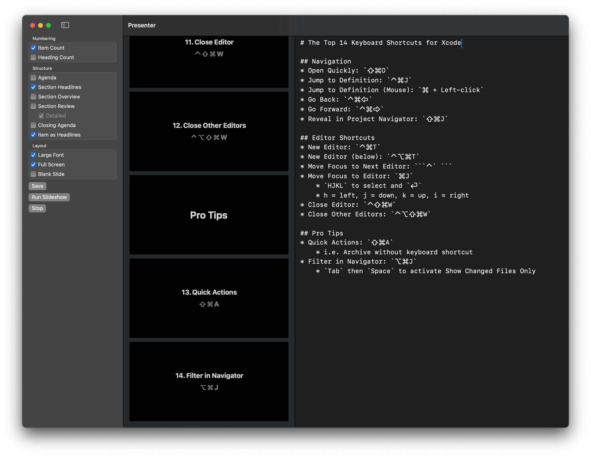 Teach the "The Top 14 Keyboard Shortcuts for Xcode" without having to manually number each item. Stop counting and renumbering items as you change your mind.