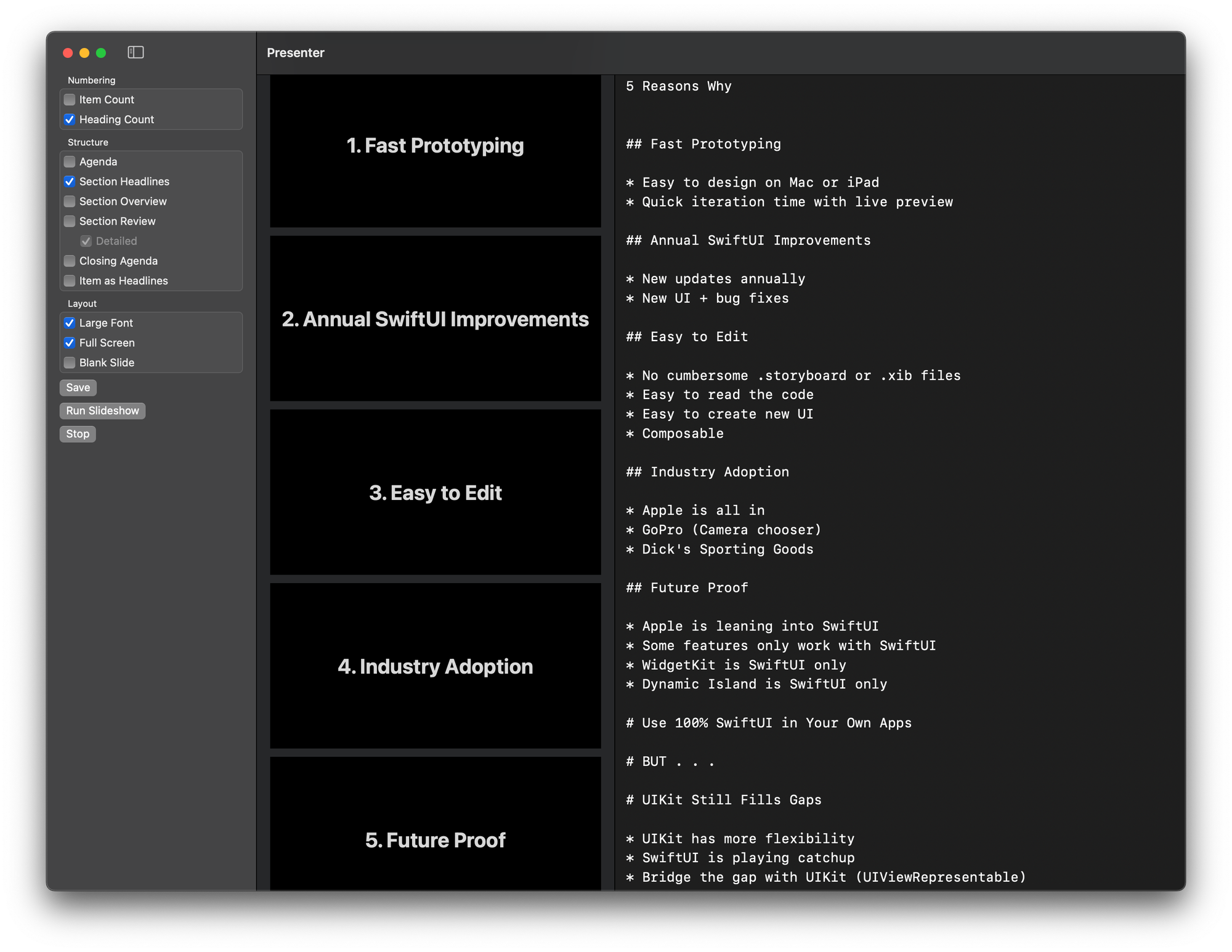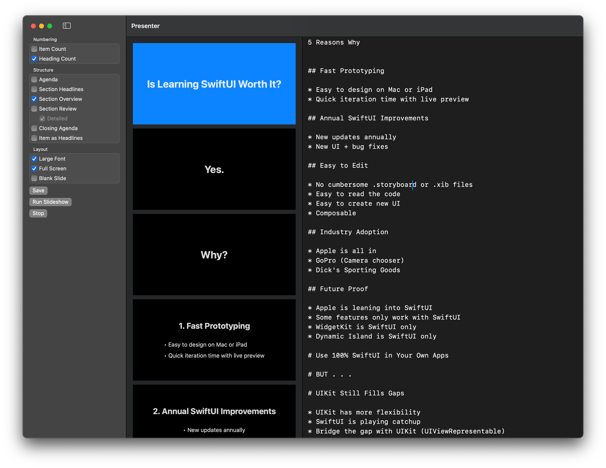 Create slideshows with ease using Super Easy Slides. Auto-generate your slide deck using Markdown H1 and H2 headings (# and ##) and skip the formatting.